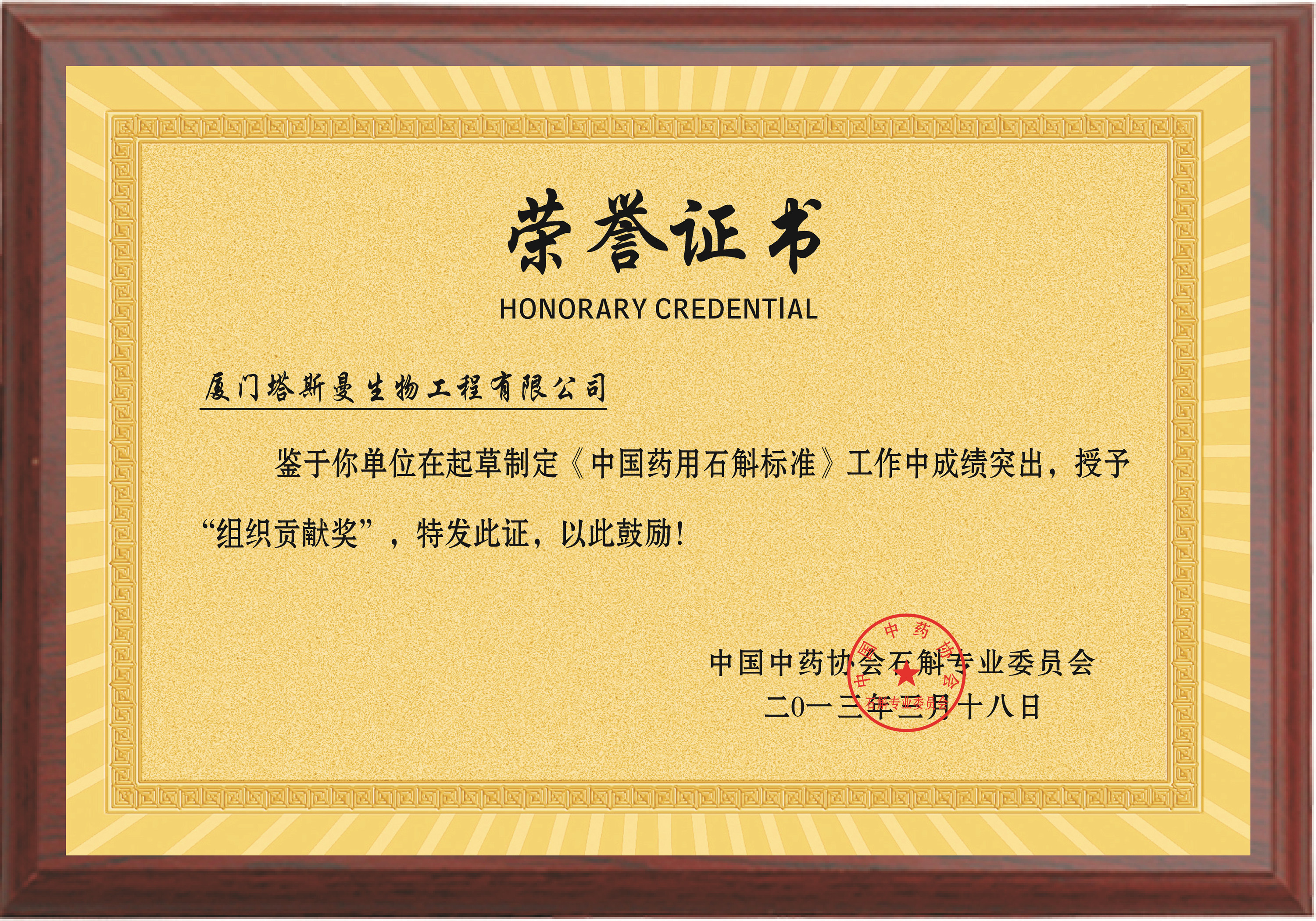 《中国药用石斛标准》“组织贡献奖”